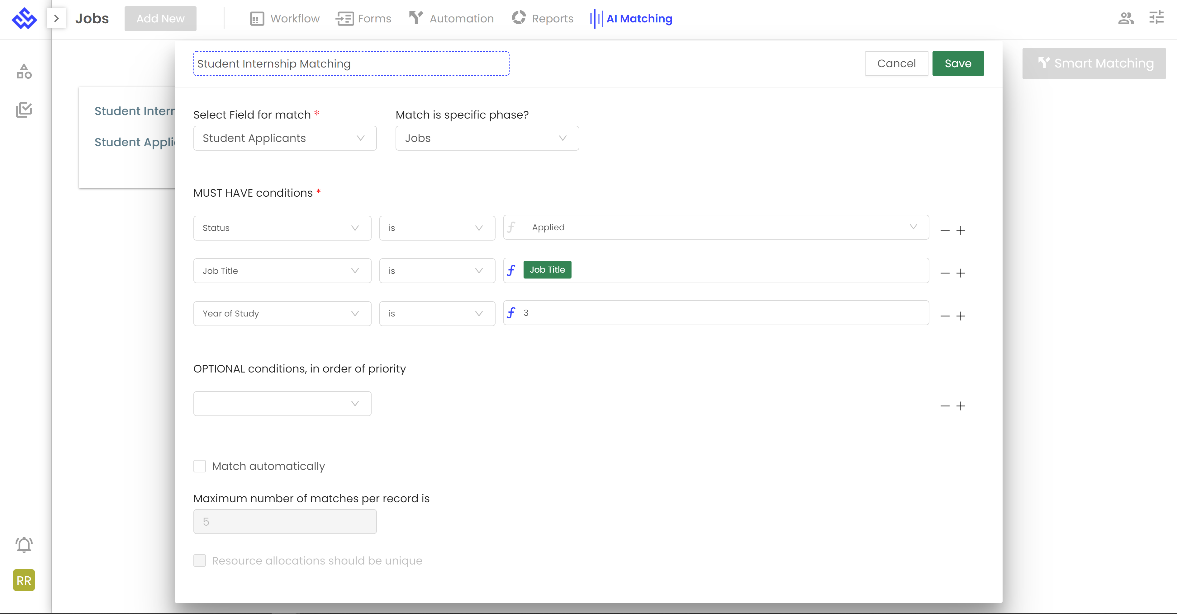 AI Matching is a feature that pairs data from different tables based on conditions that are set. For example, a company may be hiring students for internship roles. By using AI Matching, the hiring manager can see which applicants fit the job requirements based on conditions such as job applied for, school, degree, and year of study. To use AI Matching, users must first create a “Link to workflow” field within that table.